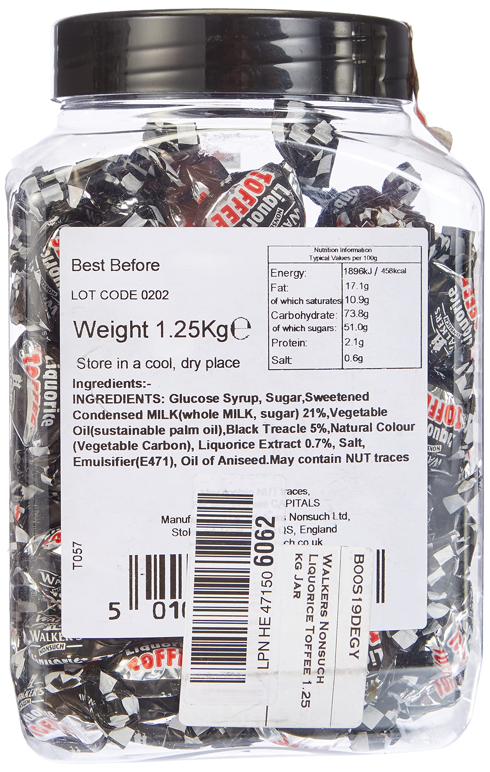 Q: What makes Walkers' Nonsuch Liquorice Toffees different from other toffees?A: Walkers' Nonsuch Liquorice Toffees are unique due to their rich liquorice flavor, which is infused into a classic British toffee. Unlike other toffees, they are handcrafted with high-quality ingredients, including real butter, ensuring a premium taste experience.