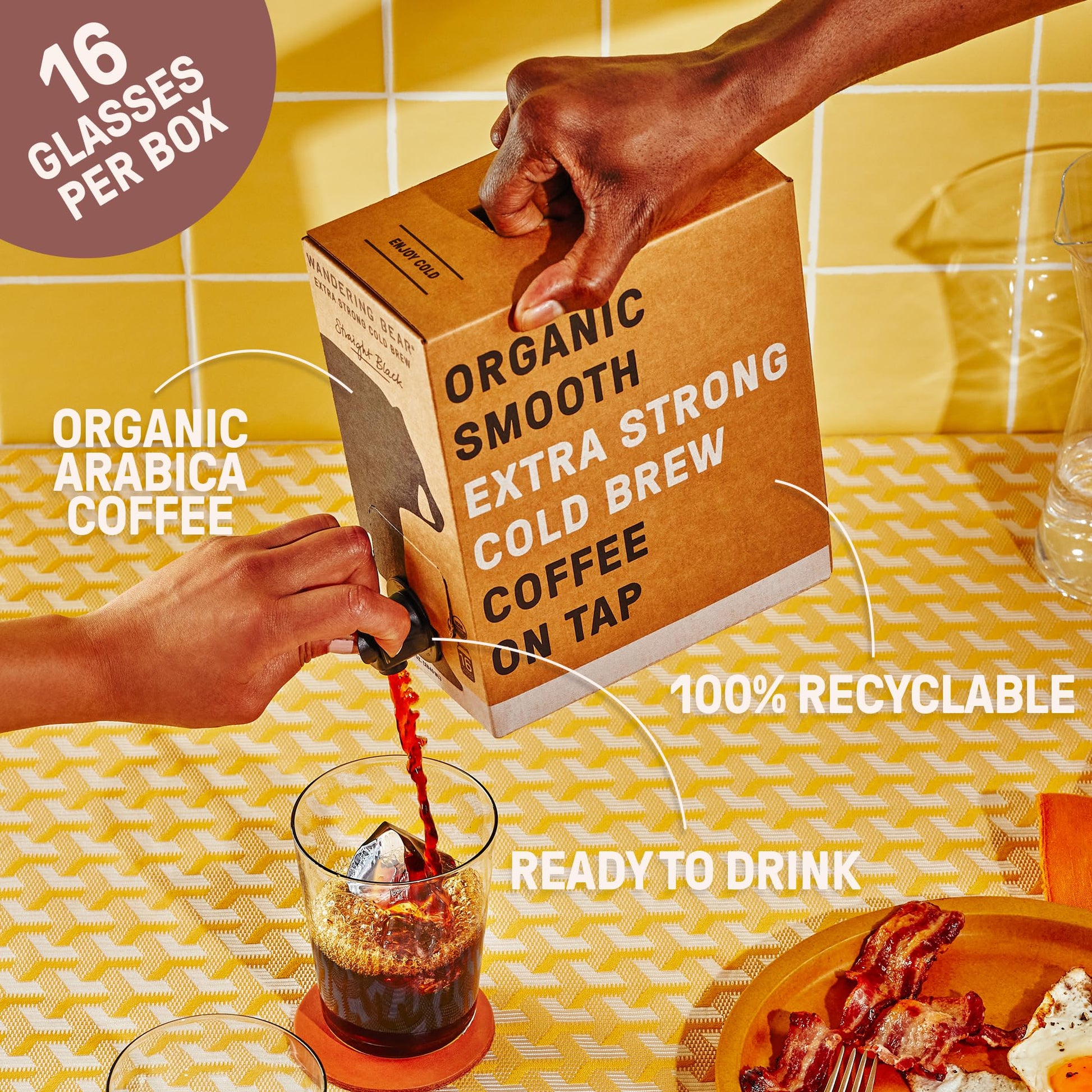 Q: How much caffeine is in each serving of this cold brew coffee?A: Each 6 oz. serving of Wandering Bear Cinnamon Cold Brew Coffee contains approximately 150 mg of caffeine, equivalent to two shots of espresso.
