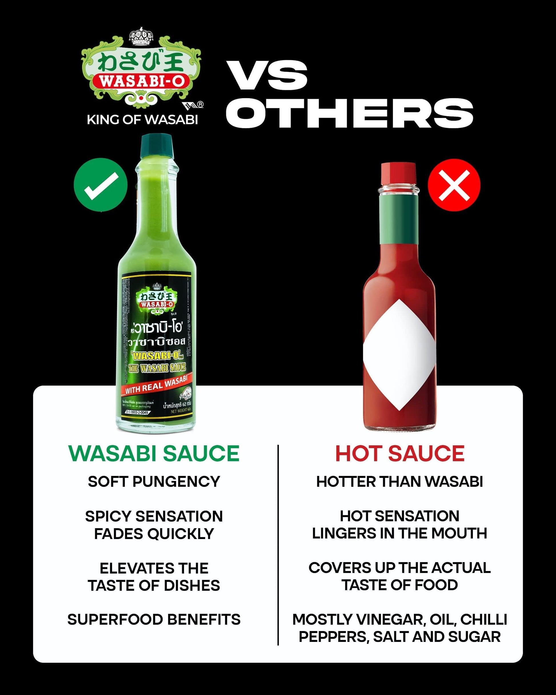 - Q: What makes Wasabi O Sauce different from regular hot sauces? A: Wasabi O Hot & Spicy Sauce is unique due to its base of real wasabi, offering a sinus-clearing effect and health benefits that typical hot sauces do not provide. It has a mild kick that enhances flavors rather than overpowering them, making it a gourmet alternative.