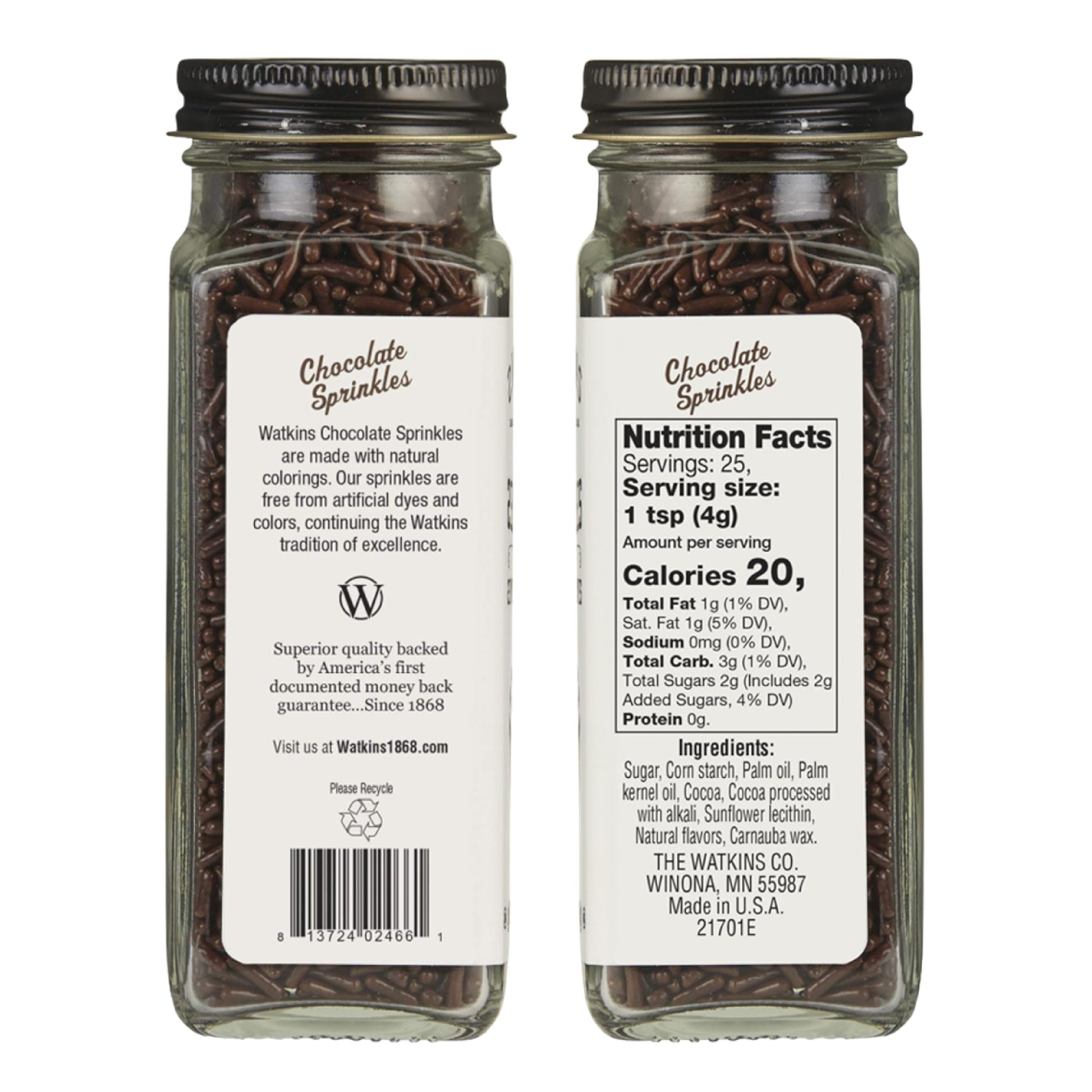 Q: What ingredients are used in Watkins Chocolate Decorating Sprinkles?A: Watkins Chocolate Decorating Sprinkles are made with natural colorings and do not contain any artificial dyes or colors, making them a healthier choice for your baking needs.