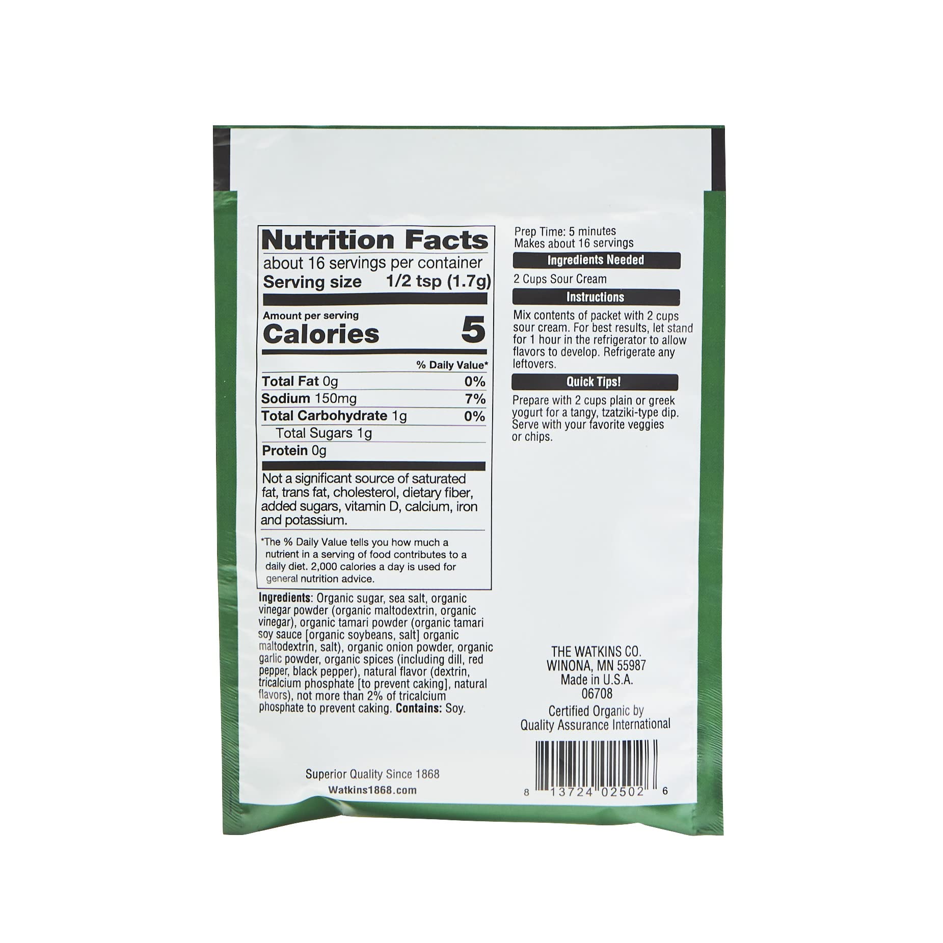 • Q: What is the packaging size for the Watkins Cucumber & Dill Dip Mix? A: The Watkins Organic Gourmet Dip Mix comes in a convenient single-use pouch, with each pack containing 0.95 ounces. This pack includes 12 individual pouches, perfect for multiple gatherings or personal use.