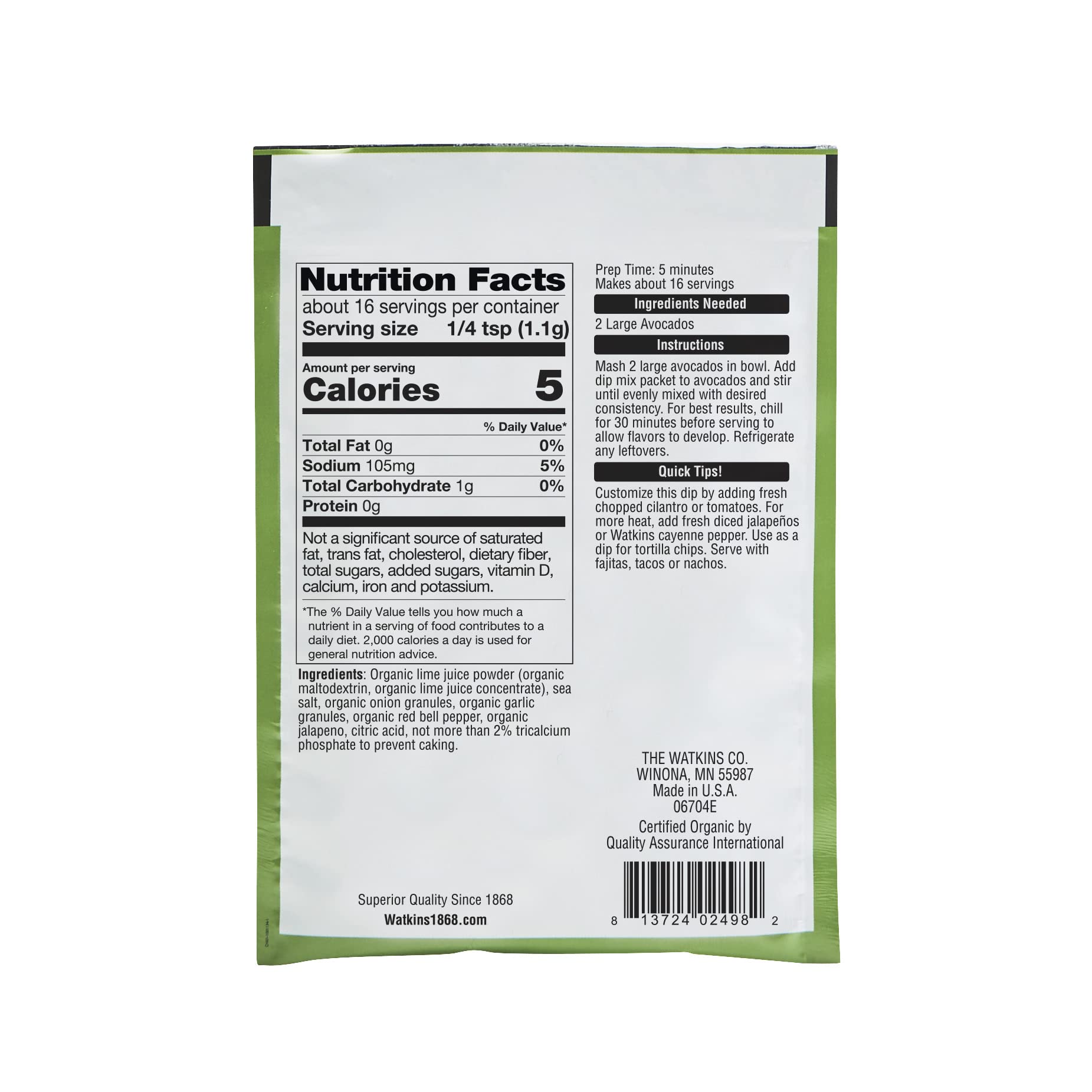 Q: How do I prepare the guacamole dip using this mix?A: To prepare the guacamole dip, simply mash two ripe avocados and mix in the Watkins Organic Dip Mix until well combined. It's quick and easy for any occasion.