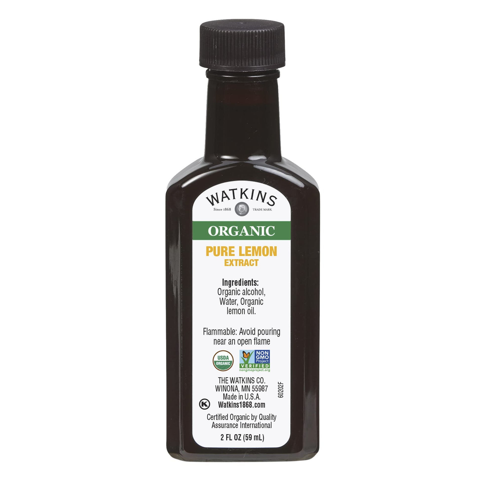 Q: What are the main ingredients in Watkins Organic Pure Lemon Extract?A: Watkins Organic Pure Lemon Extract is made from all naturally derived ingredients, ensuring a wholesome taste without artificial flavors or colors. It is USDA certified organic and verified by the Non-GMO project.