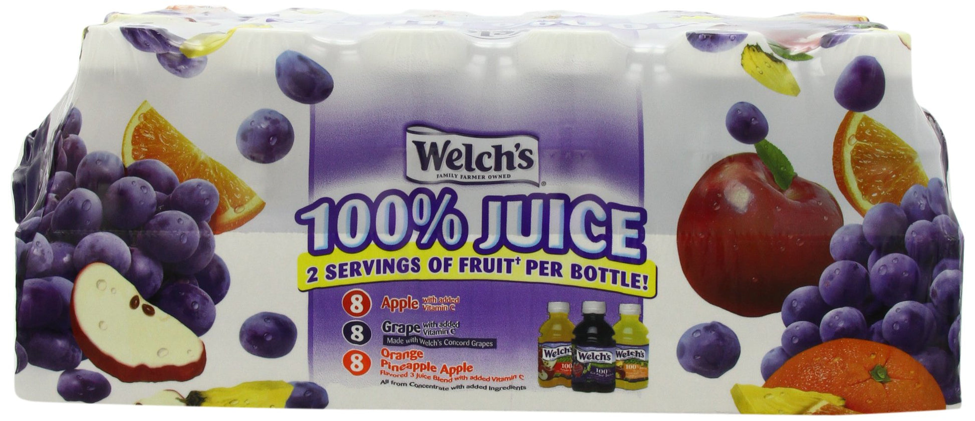 Q: What is the size of each bottle in the Welch's Juice Variety Pack?A: Each bottle in the Welch's 100% Juice Variety Pack contains 30 Fl Oz, and the total volume of the pack is 240 Fl Oz.