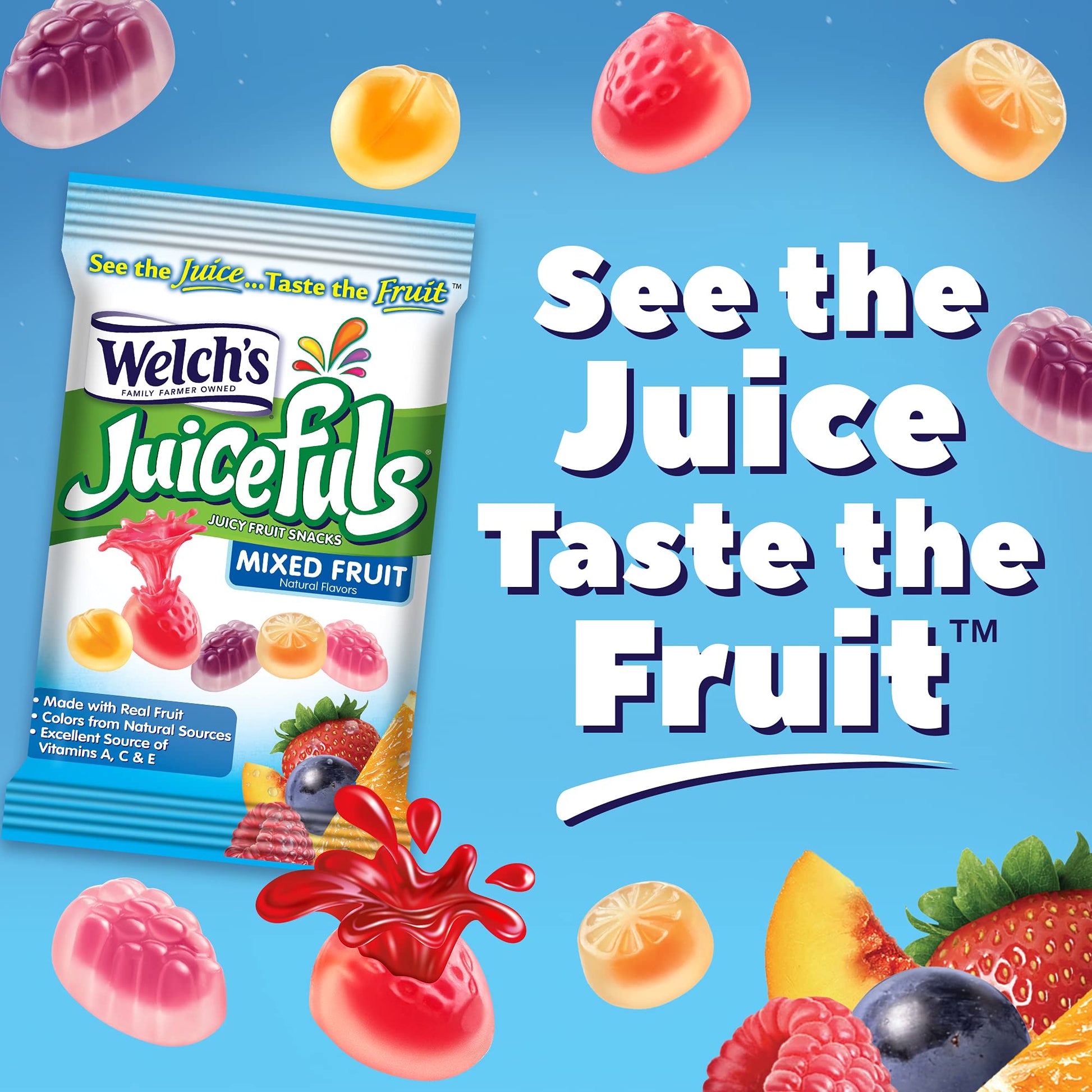 • Q: What is the size of each individual snack bag in the pack? A: Each individual snack bag in the Welch's Fruit Snacks & Juicefuls combo pack comes in sizes of 0.8 ounces and 1 ounce.