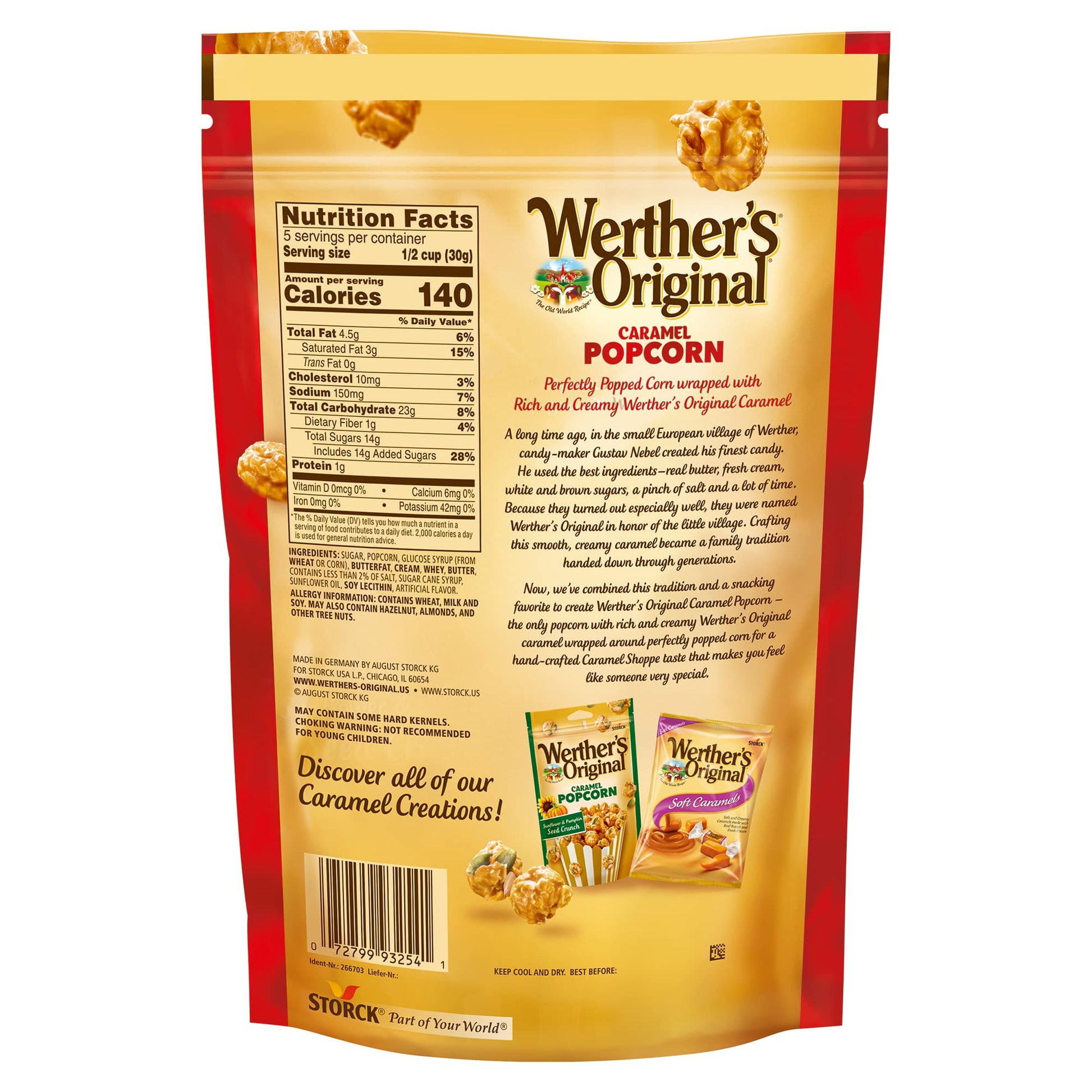 Werther'S Original Caramel Popcorn Is The Only Popcorn With Rich, And Creamy Werther'S Original Caramel. Werther'S Original Caramel Popcorn Is Perfectly Popped Popcorn Mixed With Rich And Creamy Werther'S Original Caramel To Make The Perfect Snack To Satisfy A Sweet Tooth. The Perfect Ready To Eat Treat For A Movie Night, Party, Or For Yourself! Werthers Original Is Made With Only The Finest Ingredients Blended Together With The Same Passion And Care Our First Candy Maker, Gustav Nebel, Brought To Every Candy He Crafted. Made With Real Butter And Fresh Cream, For A One Of A Kind Taste. One 5.29 Oz Bag Of Werther'S Original Caramel Popcorn.