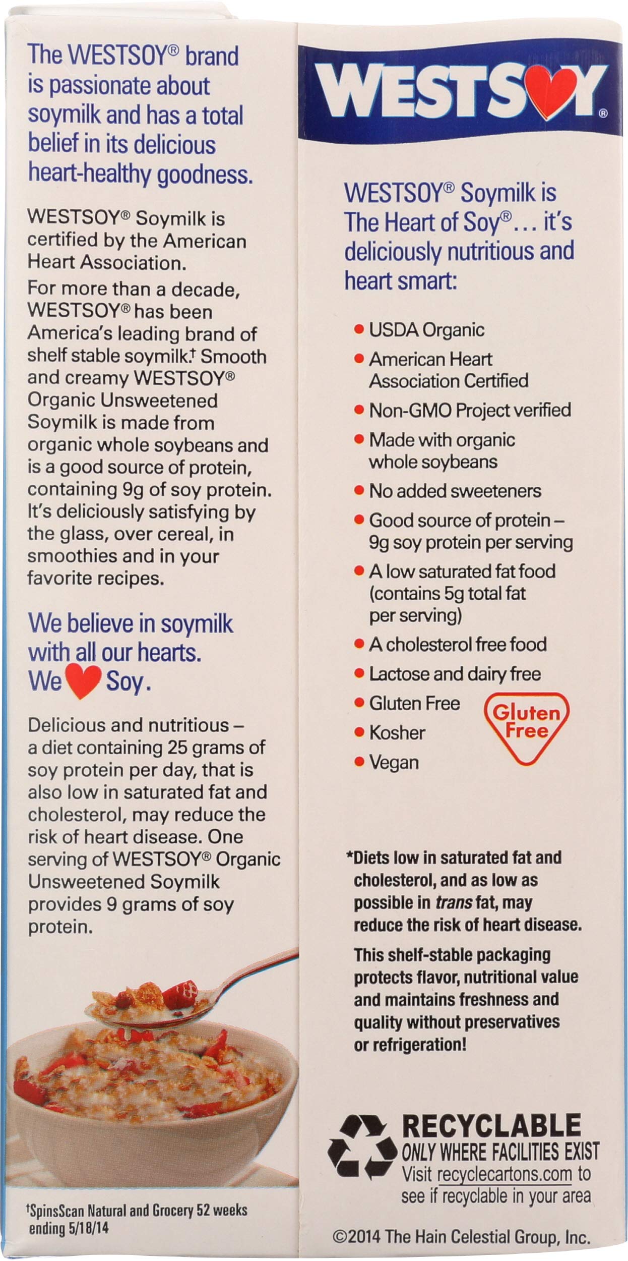 Westsoy Soymilk, Unsweetened Original helps you control how much sugar you want, if any at all. These delicious soymilks provide 36% of your daily recommended Soy Protein intake, 46 mg of isoflavones, are cholesterol free, and full of delectable flavor in each serving. The unsweetened soymilk is also USDA certified organic.