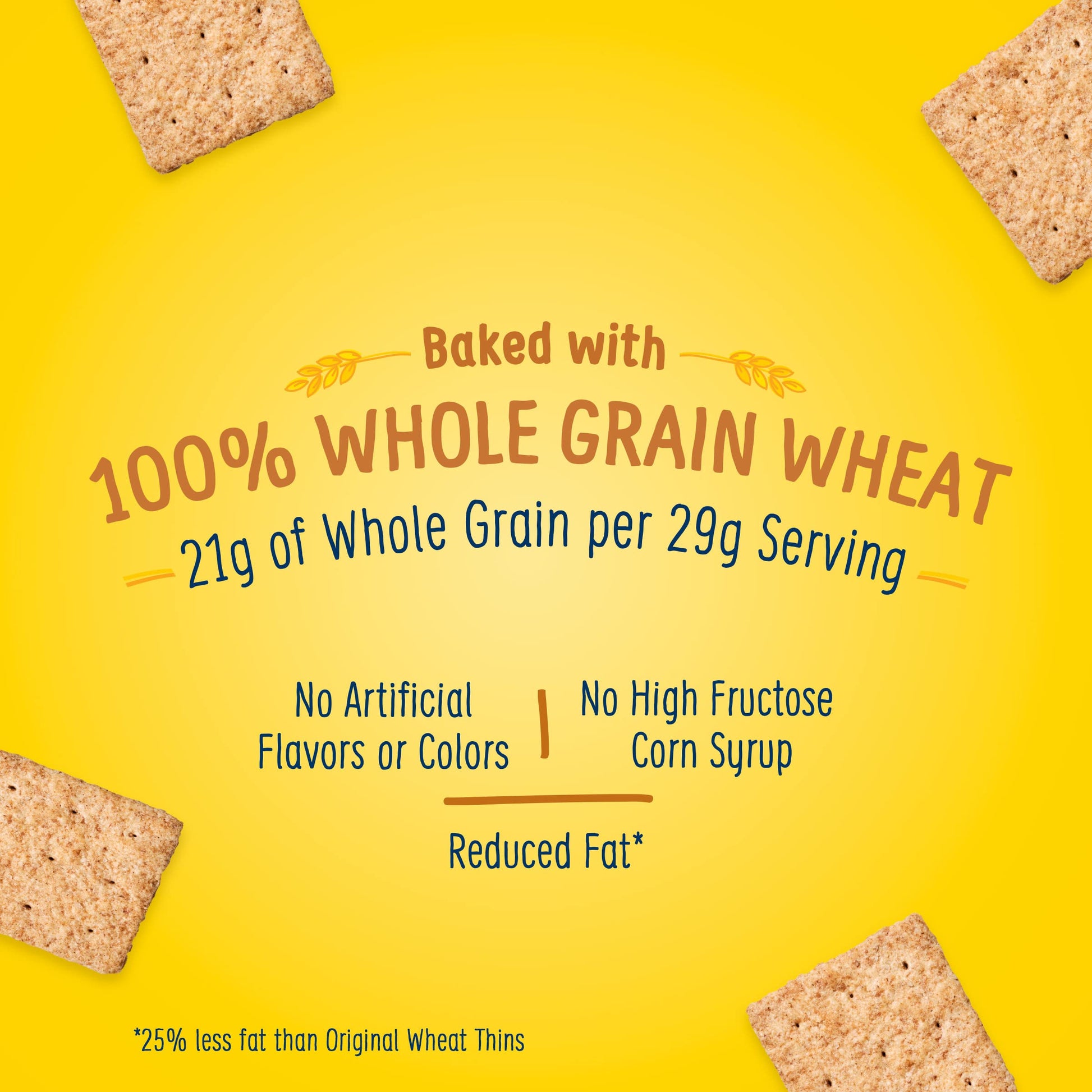 Upgrade your snacks with the satisfying crunch of Wheat Thins Reduced Fat Snacks, Whole Grain Wheat Crackers. Made with 100% whole grain wheat, these savory snacks have a nutty, whole grain flavor that makes these snack crackers a great companion to dips, spreads, and toppings. With a salty-sweet taste and a crunchy texture, these crispy, thin reduced fat crackers have 25% less fat than original Wheat Thins and contain no artificial flavors and colors. Each serving contains 21 grams of whole grain, making these baked crackers wonderful whole grain snacks for adults. Take cheese and crackers to the next level during relaxing evenings at home with reduced fat Wheat Thins. Elevate your party snacks pairing these whole grain crackers with dips or adding them to a cheese tray or charcuterie board.