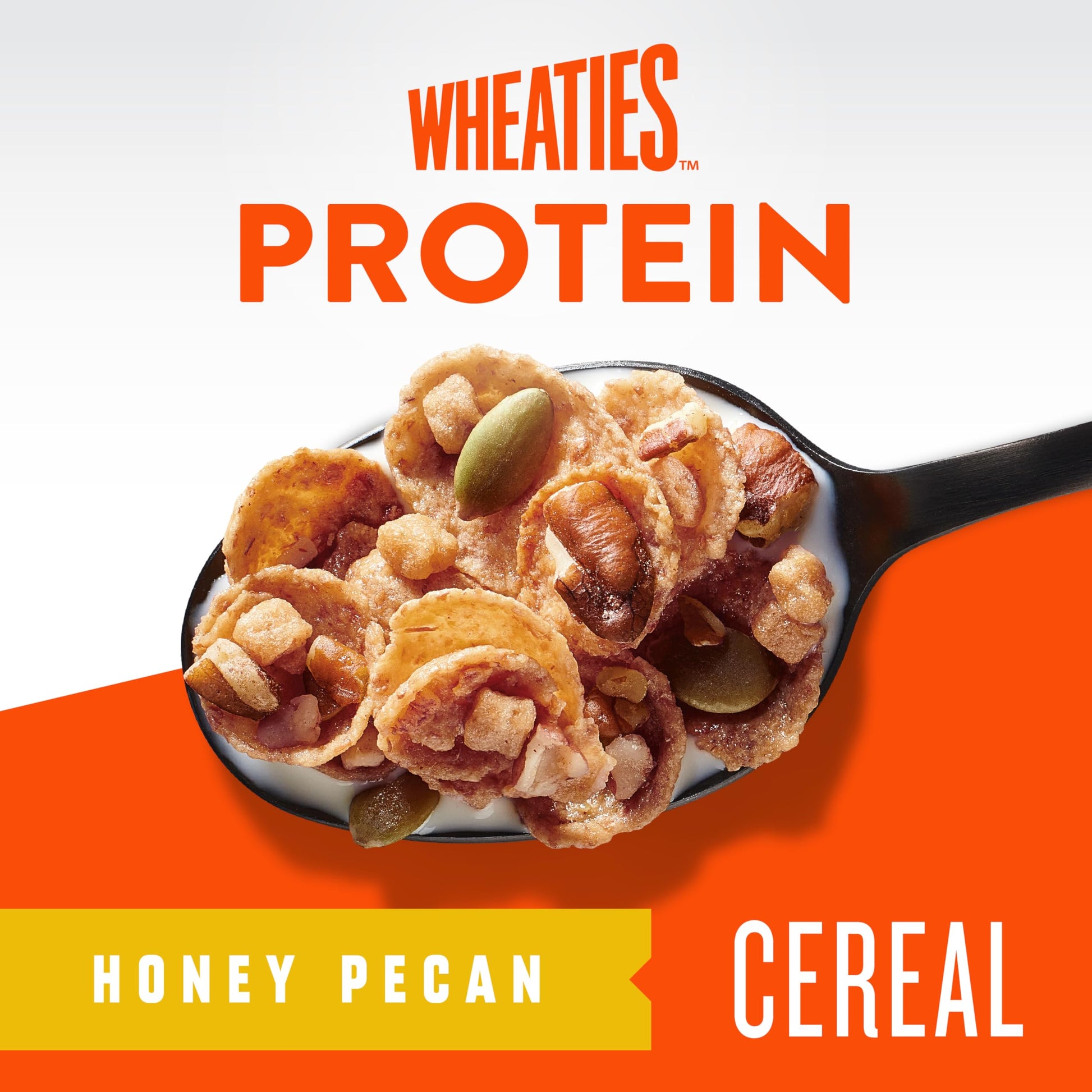 - Q: What ingredients are in Wheaties Protein Breakfast Cereal? A: Wheaties Protein Breakfast Cereal features a tasty blend of honey pecan clustered flakes, pecans, and pumpkin seeds, sweetened with honey. It is made from whole grain wheat, ensuring a nutritious start to your day.