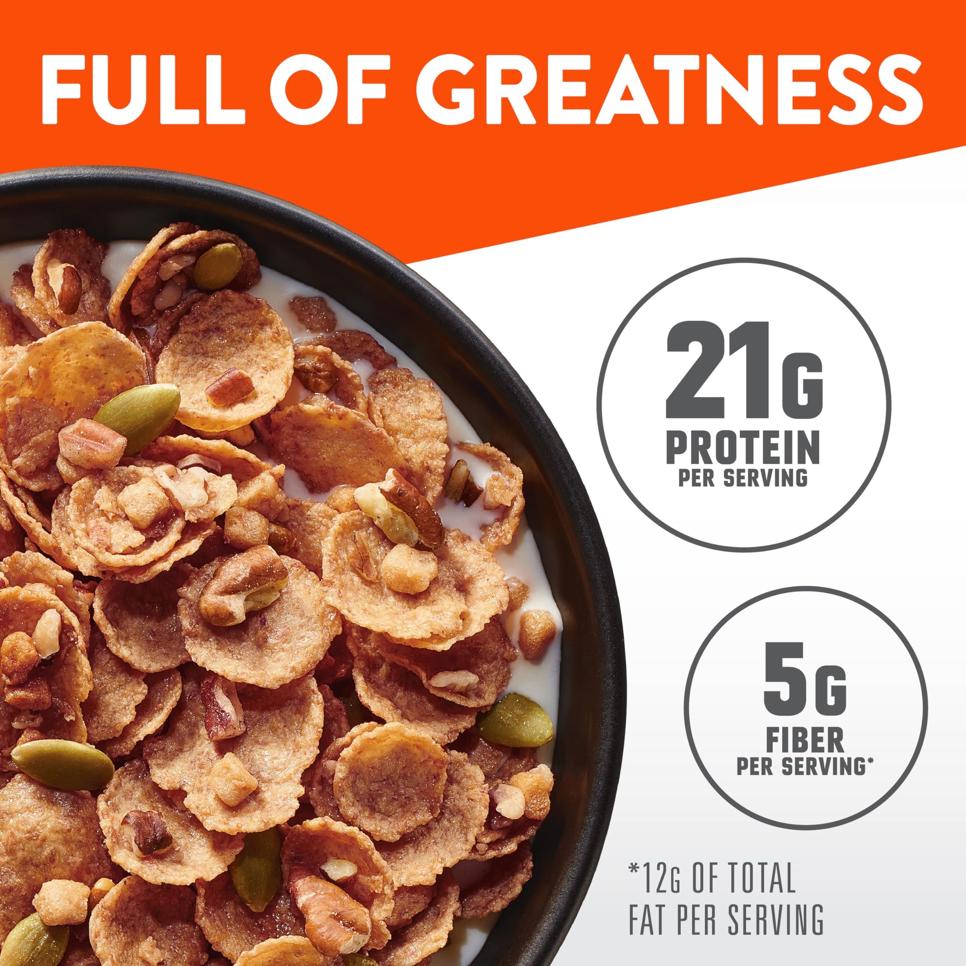 - Q: What are the main nutritional benefits of Wheaties Protein Breakfast Cereal? A: Wheaties Protein Breakfast Cereal offers 21g of protein per serving, making it an excellent option for those looking to increase their protein intake. Additionally, it provides 5g of fiber, 17g of whole grain, and only 6g of sugar, contributing to a balanced breakfast.