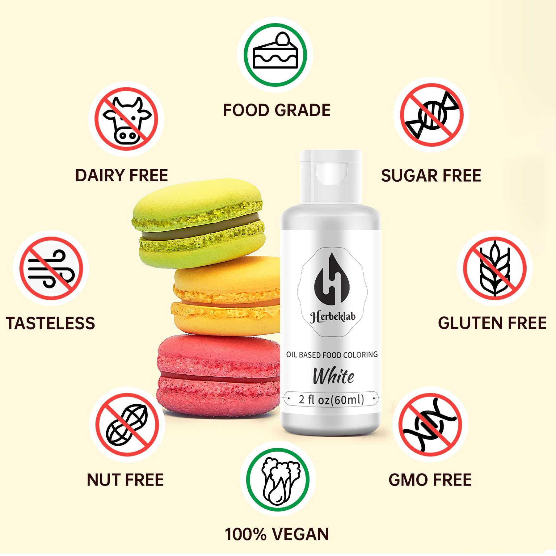 - Q: How concentrated is the white oil-based food coloring? A: The formula is highly concentrated, meaning you only need a few drops to achieve vibrant and vivid results. This improved formulation ensures that you get intense and pure shades without the need for excessive amounts of coloring.