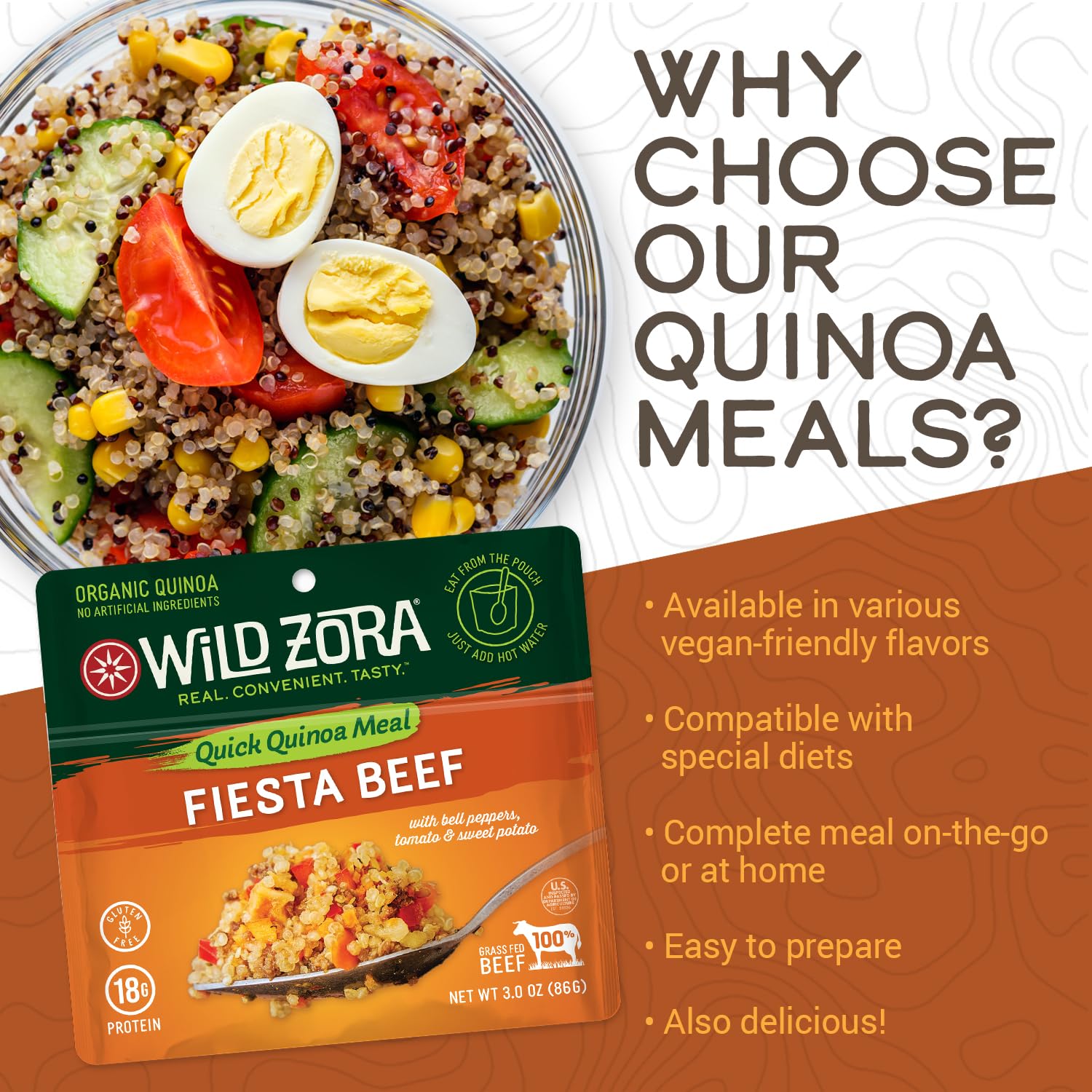 - Q: What are the main ingredients in Wild Zora Instant Organic Quinoa Meals? A: Wild Zora Instant Organic Quinoa Meals primarily contain organic quinoa, grass-fed beef, lentils, vegetables such as tomatoes, sweet potatoes, and bell peppers, along with spices and a packet of cold-pressed extra virgin olive oil.