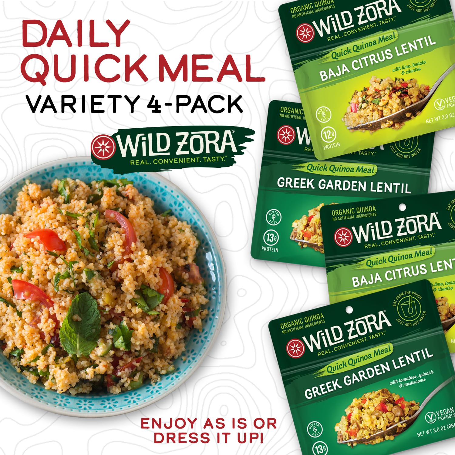 - Q: What are the key ingredients in Wild Zora Instant Organic Quinoa Meals? A: Wild Zora Instant Organic Quinoa Meals are made with Royal Bolivian quinoa, lentils, vegetables, and various spices. They are gluten-free, nut-free, dairy-free, and soy-free, with no artificial ingredients.