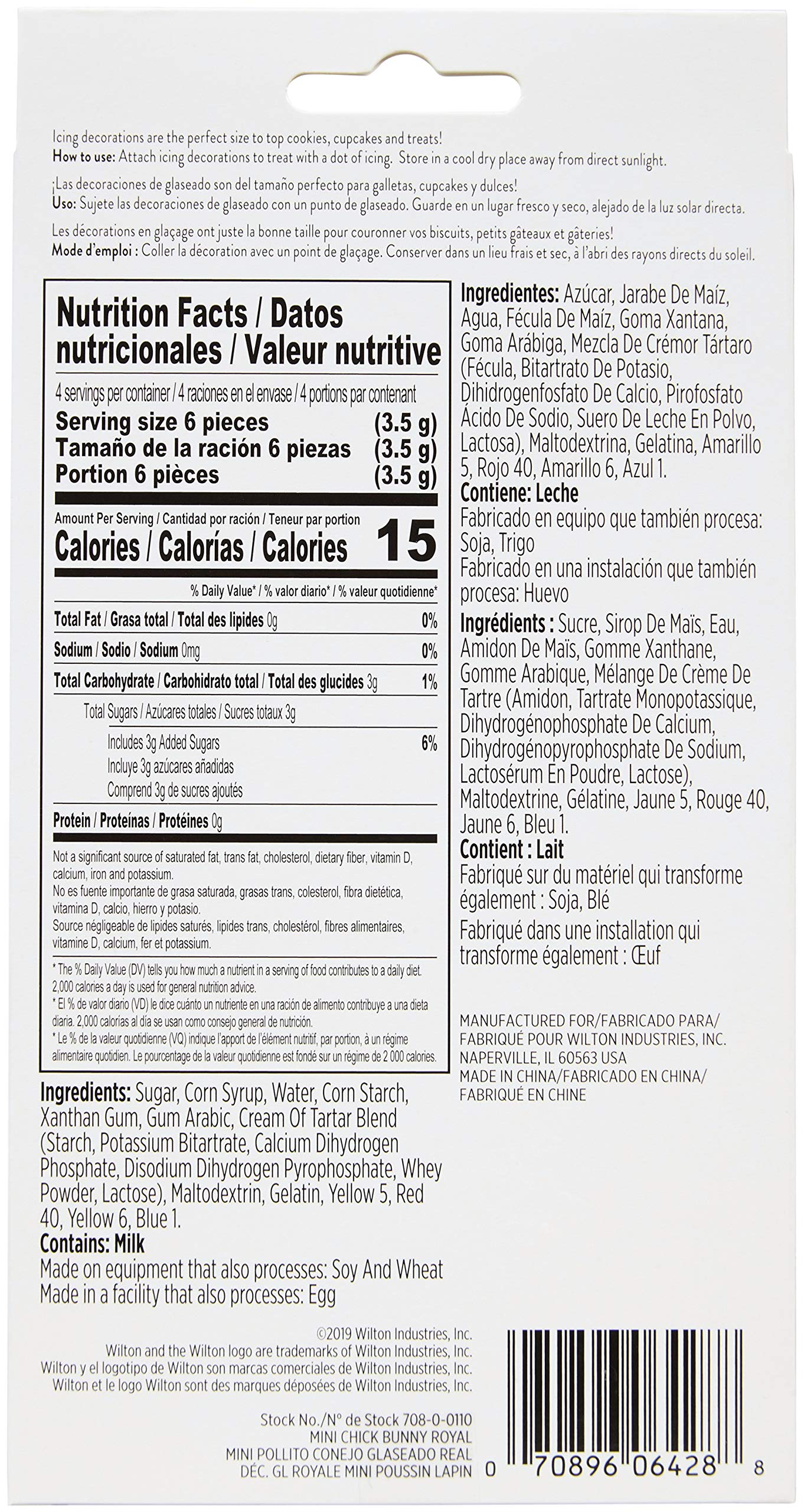 Q: What are Wilton Icing Decorations, Mini Chicks and Bunnies used for?A: Wilton Icing Decorations, Mini Chicks and Bunnies are perfect for adding a festive touch to cakes, cupcakes, and desserts. They are ideal for Easter-themed treats and can enhance the visual appeal of any baked goods.