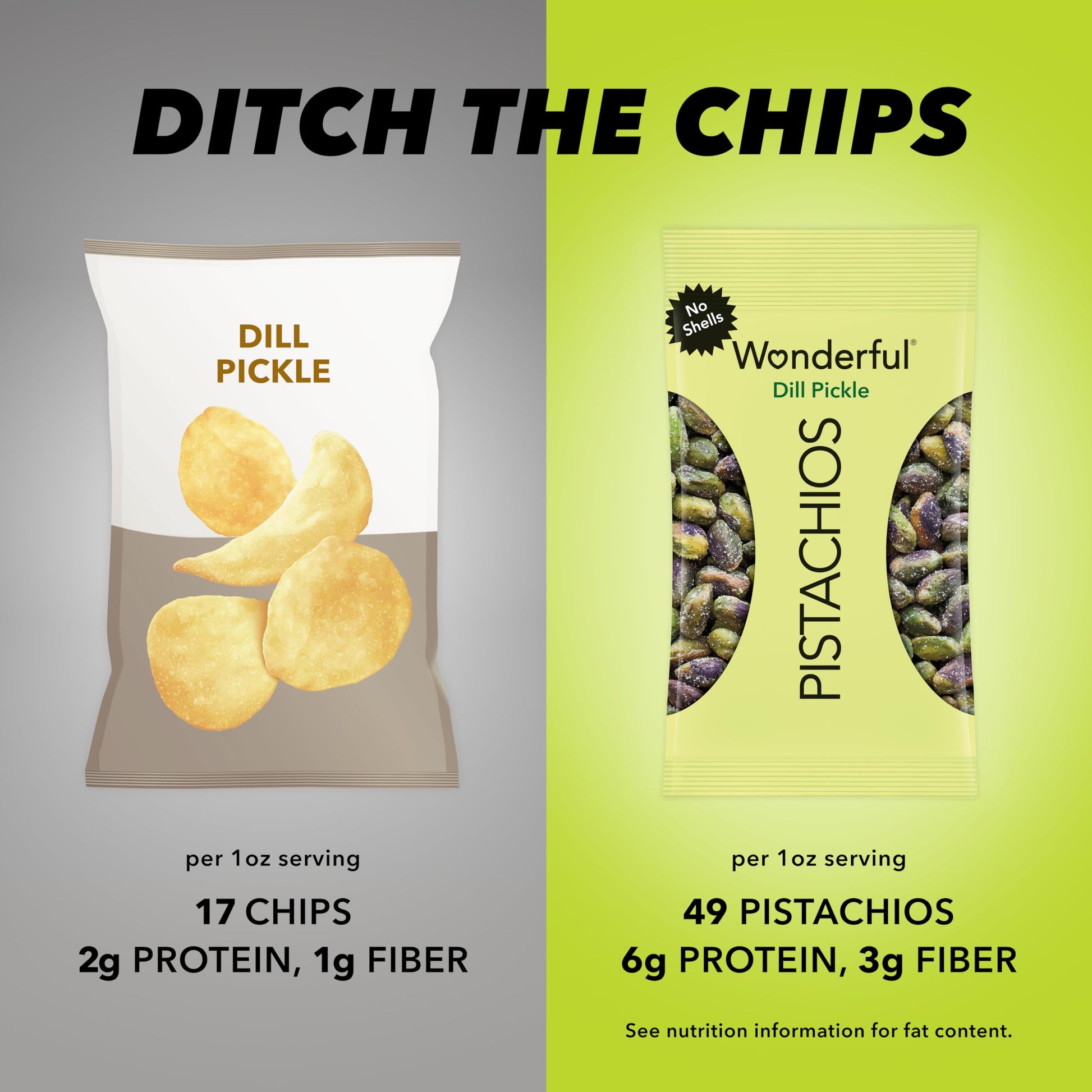 One Box Of 8 Individually Wrapped 2.25 Ounce Bags Of Our Dill Pickle No Shells Wonderful Pistachios. Try Bold New Wonderful Pistachios No Shells Dill Pickle! Enjoy The Tangy Dill Pickle Flavor You Love With The Benefits Of Pistachios, Like Protein And Fiber.