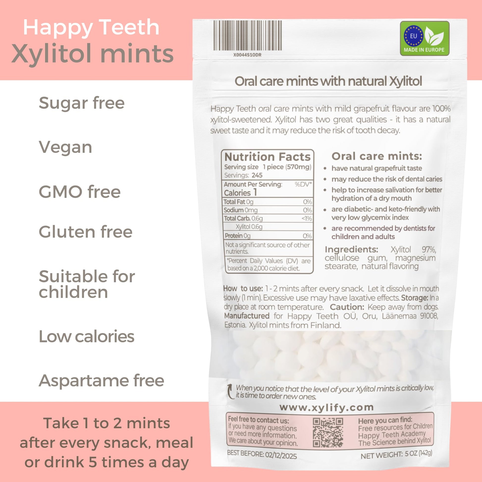 Q: Are Happy Teeth mints suitable for children?A: Yes, Happy Teeth Xylitol mints are recommended by dentists for both children and adults. They contain 97% xylitol, a natural sweetener that is safe for dental health.