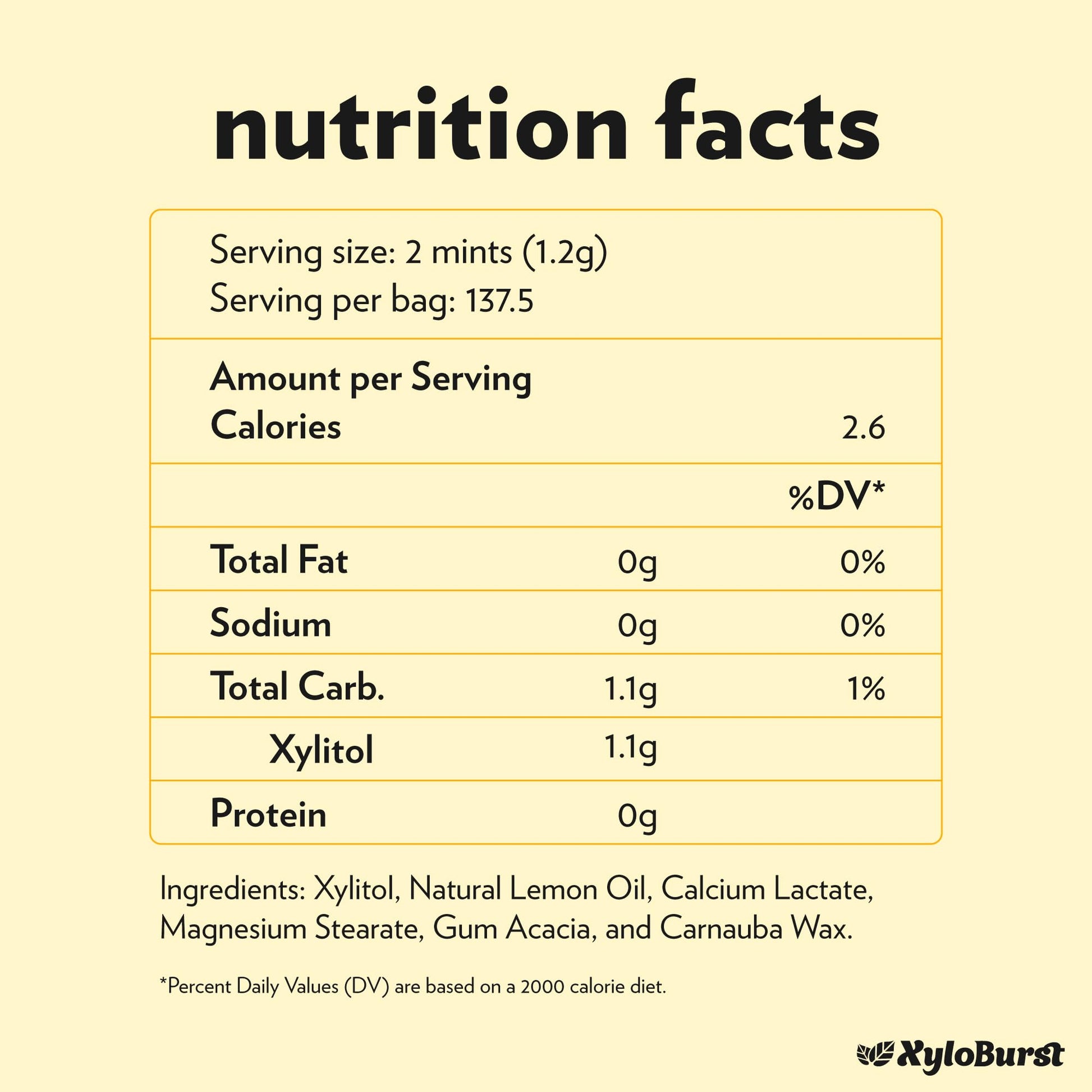 - Q: What are the main ingredients in XyloBurst mints? A: XyloBurst mints are sweetened exclusively with 100% xylitol, a natural sugar substitute. They are also aspartame-free and crafted with natural flavors, making them suitable for various dietary preferences, including vegan, gluten-free, and keto-friendly.