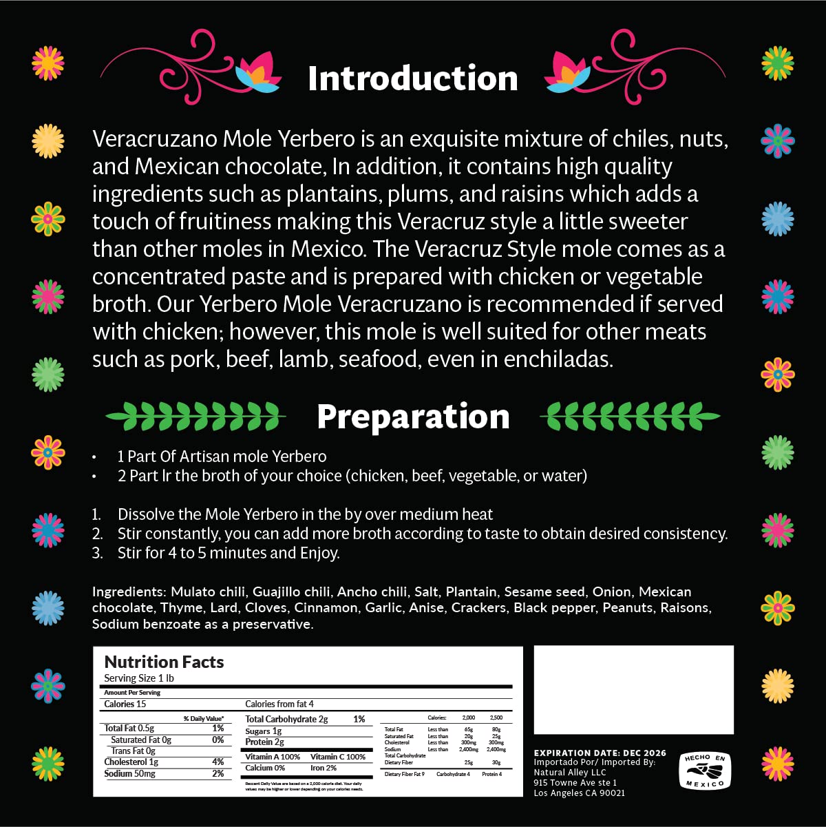 Yerbero Mole Veracruzano is crafted from a unique blend of high-quality ingredients, including mulato, guajillo, and ancho chiles, as well as traditional Mexican chocolate. The addition of plantains, plums, and raisins contributes a delightful sweetness, distinguishing this Veracruz style mole from others in Mexico. Packaged as a concentrated paste, it is designed for easy preparation. Simply mix the mole with chicken or vegetable broth, and in just five minutes, you can enjoy a rich and flavorful sauce.