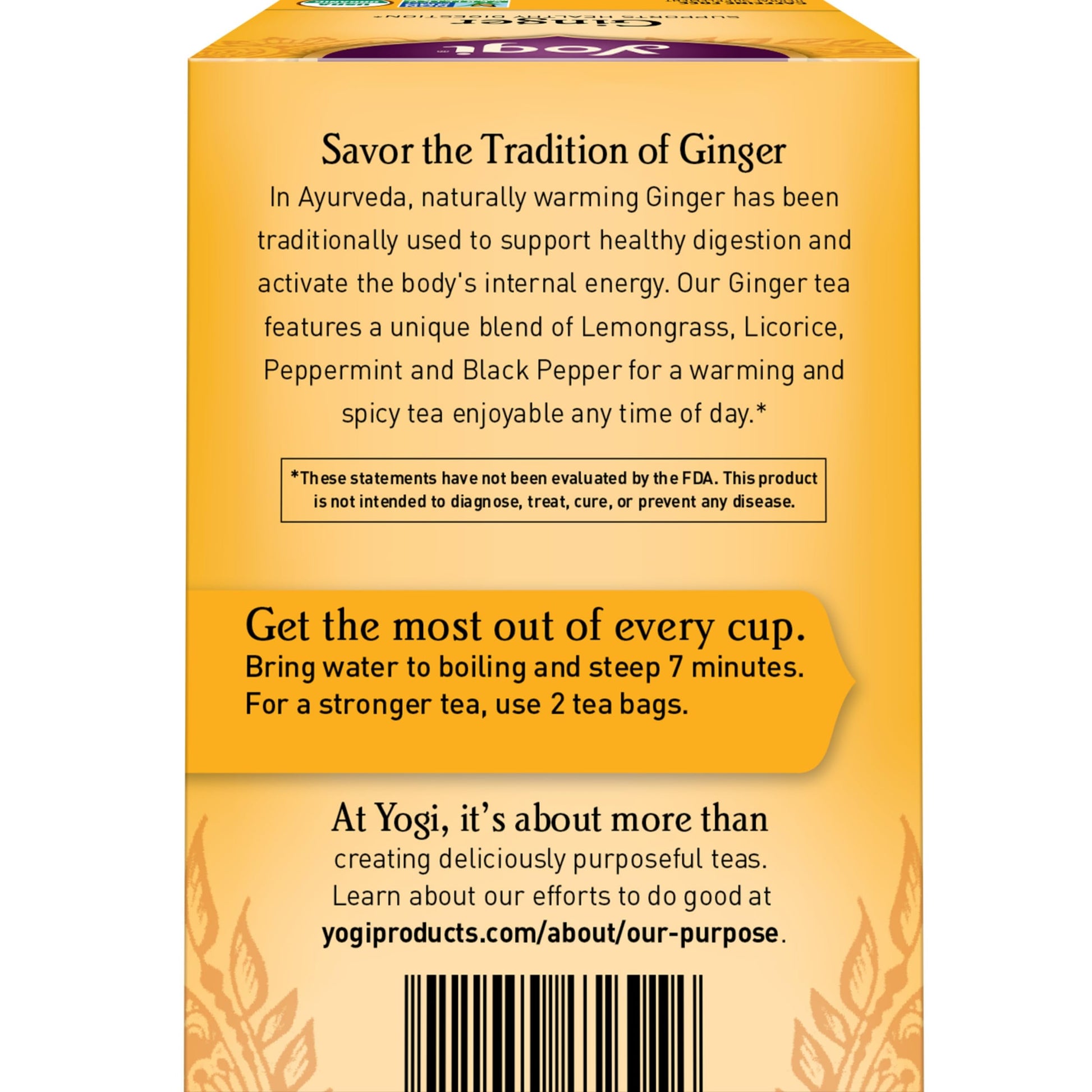 - Q: How does Yogi Ginger Tea support digestion? A: Yogi Ginger Tea is known for its digestive support properties. Ginger has a long history of use in aiding digestion, making this tea an excellent choice for those seeking relief from digestive discomfort. The blend of Ginger with Licorice Root adds a subtle sweetness that enhances its soothing effect.