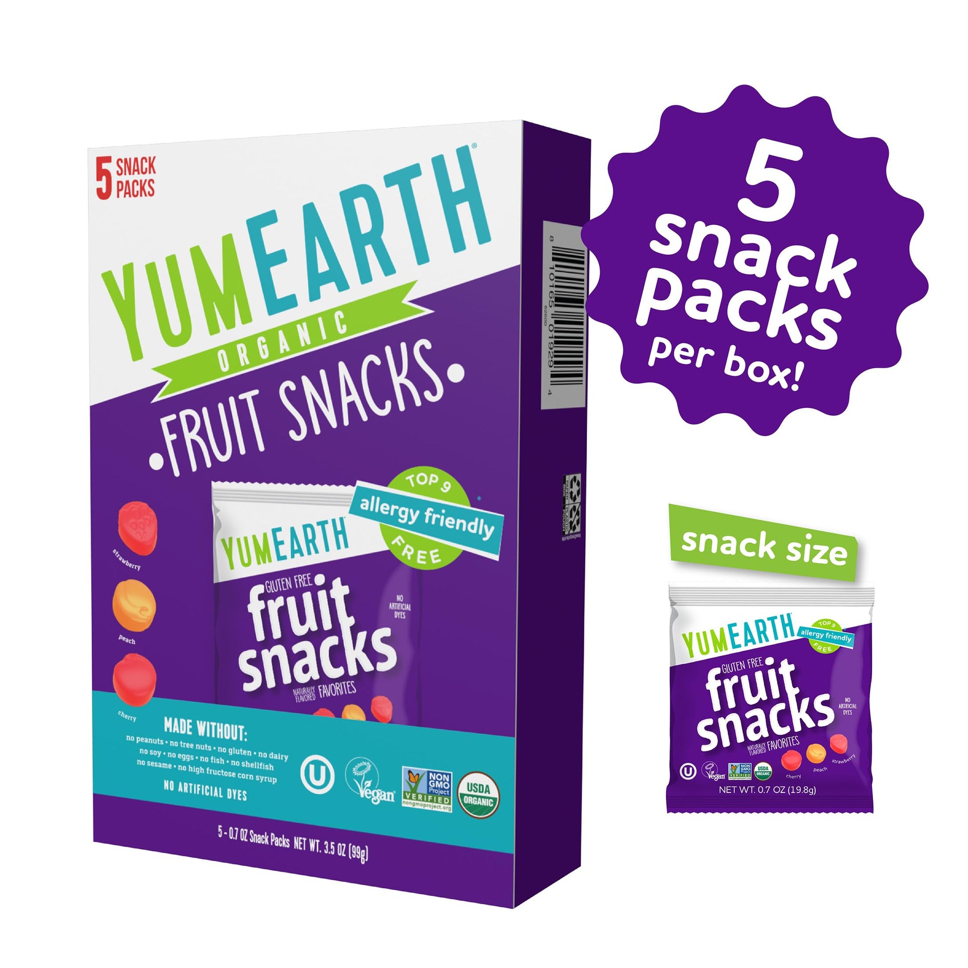 INDIVIDUALLY WRAPPED SNACKS: Contains 5 - .7 ounce single-serving packs of YumEarth Organic Assorted Flavor Fruit Snacks | ASSORTED FRUIT FLAVORS: Organic fruit flavors may include Strawberry, Cherry, Peach and Banana | NO ARTIFICIAL INGREDIENTS: Our Fruit Snacks are colored with real fruit and vegetables juices, no high fructose corn syrup or artificial dyes here | ALLERGEN FREE AND ORGANIC: YumEarths sweet treats are free from the top 9 common allergens and are USDA Organic Certified, Non-GMO Certified, and Gluten Free | DELICIOUS TREATS: We make delicious, allergy-friendly treats that everyone can enjoy. Our yummy snacks are perfect for class parties, school snacks, lunch snacks and on-the-go