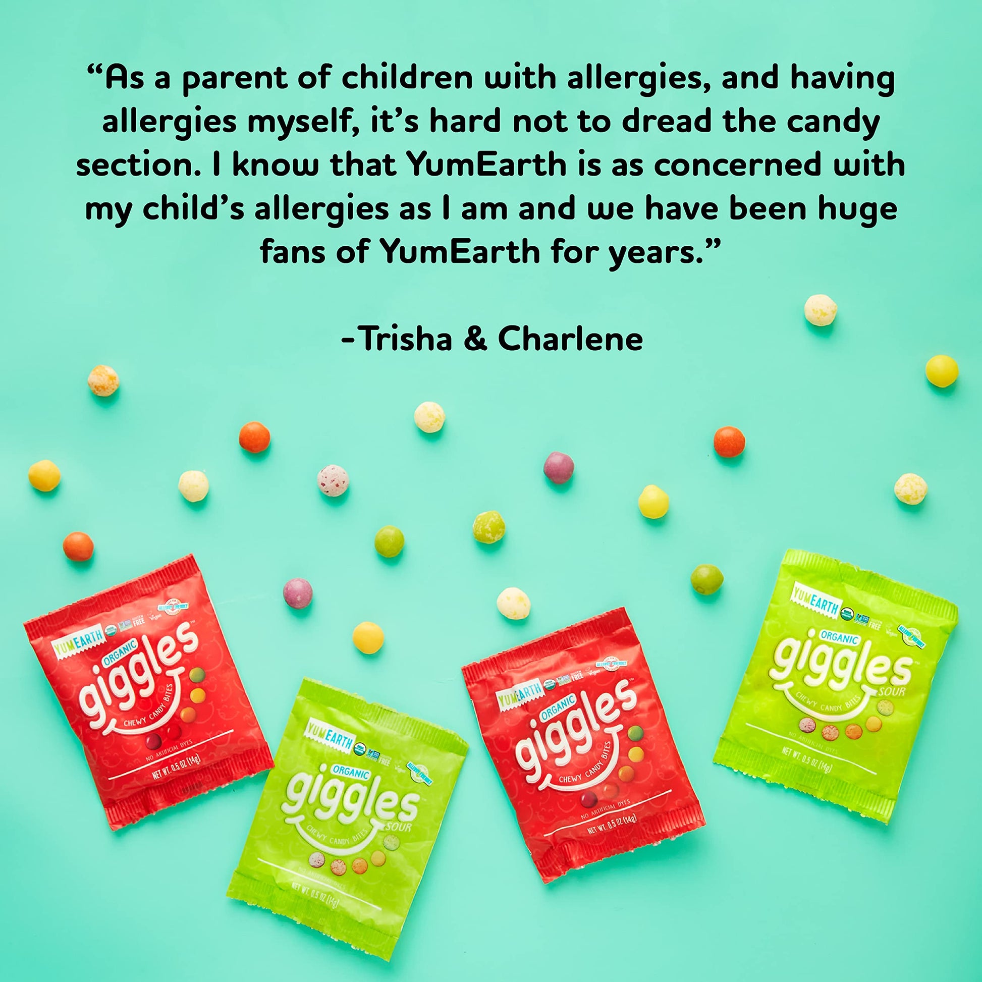 YumEarth Giggles are the allergy friendly version of your favorite sour chewy candy treat. These chewy candy bites come in 5 fantastic tart flavors: Sour Green Apple, Sour Lemon, Sour Orange, Sour Strawberry and Sour Grape. What makes our treats so scrumptiously friendly? Simple, organic ingredients free from the top 8 allergens. We never use things like high fructose corn syrup, artificial dyes or GMOs so your family can snack safely. Since 2007, YumEarth has been making organic candy with a whole lotta love and simple ingredients you can pronounce. We are proud to make safer allergy friendly and tasty treats that you can feel good about giving your family and sharing with friends. Our mission is to make lifes moments a little sweeter, simpler and filled with joy.